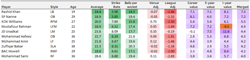 Don’t be too alarmed by Mustafizur’s negative rating in the last year – it is based on just two performances during an injury riddled season. The fact that he even makes the list is testament to an incredible start to a fledgling T20 career. And as a quick, his abilities at the death should further increase his value to teams. Although the injury could be a concern in a world of brittle pace bowlers