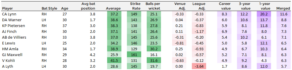For example, the table below suggests that Chris Lynn is worth 8.3 runs more than an average IPL batsman. This figure draws on every game in his career but is weighted to more recent performances and probably represents a decent best guess as to his current value. However, I wanted to capture a sense of which players are ‘hot’ right now and so I have included a couple of extra statistics. I have also included the same Runs Added statistic, but only using data from the past year, and from the past 3 years. The final rankings are based on a merged combination of all three