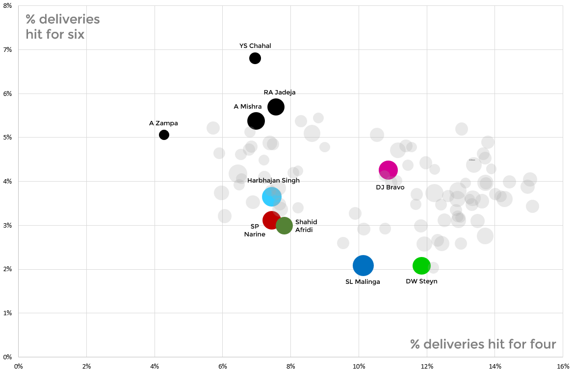 On the other far end of of the spectrum we have Dwayne Bravo, a T20 bowler known for his performances at the death. Unfortunately, bowling at the death comes with its hazards and Bravo is certainly not immune to them. He has one of the lowest dot ball rates in T20 cricket (29.7%). Admittedly, dot balls are only part of the equation and he does take a lot of wickets - on 5.8% of deliveries. It seems that his willingness to bowl in the final overs is matched only by how eventful those overs turn out to be