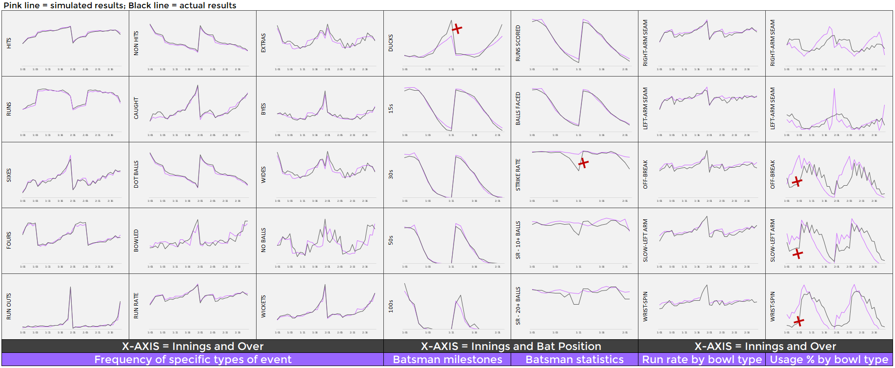 Generally, the predictions were excellent, even at a very granular level. The simulator did struggle to get the balance right with the bowlers – too much spin in the Powerplay – and it gives too much credit to tail-enders at the end of an innings. Otherwise, the simulator seems to provide an extremely accurate reflection of reality
